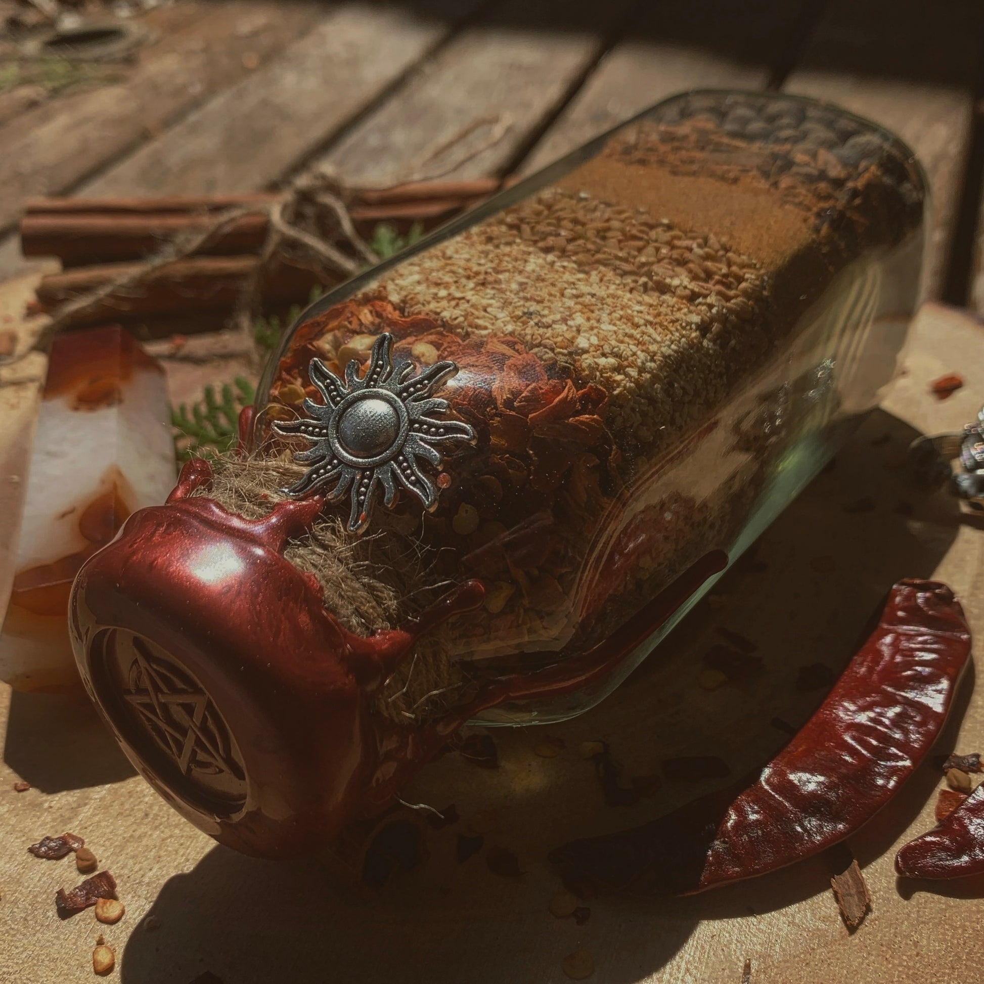 The Fire Witch’s Spell Bottle can act as an offering to a diverse number of fire deities and spirits such as Agni, Apollo, Amaterasu, Brigid, Hestia, Lugh, Mars, Pele, and Ra among others.